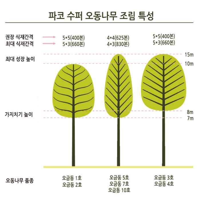 파코가 공급하는 수퍼오동나무는 조림목적과 기후 조건에 따라 다양하게 선택이 가능합니다. 품종에 따라 식재 간격이 다르고, 가지치기의 높이가 다릅니다. 아래의 나무특성에 맞춰 식재를 하여야 합니다. 파코는 새로운 오동나무의 품종 개발과 도입에 진심을 다하고 있습니다. 작은 면적에서 최대의 생산성을 확보하도록 최선을 다할 것입니다.